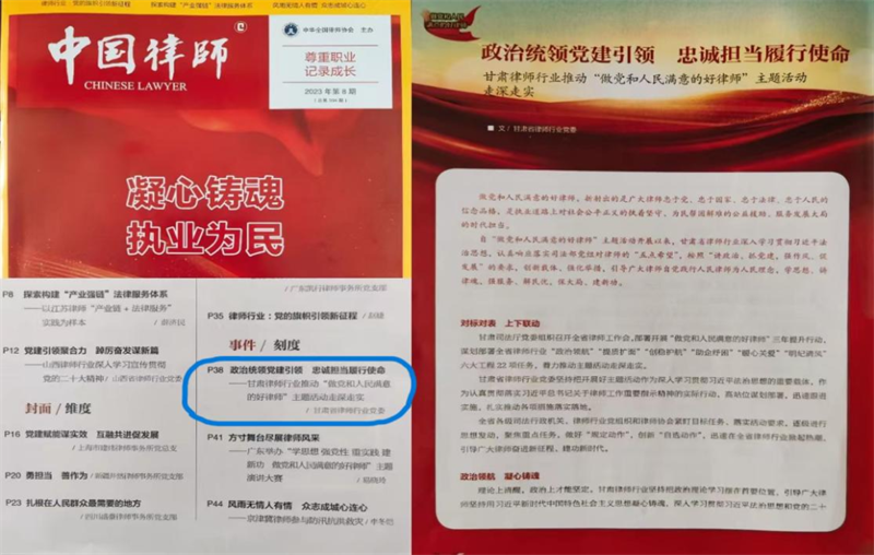 近日,《中国律师》杂志(2023年第8期)以“政治统领党建引领 忠诚担当履行使命”为题,刊发甘肃律师行业“做党和人民满意的好律师”经验做法,从“对标对表、上下联动,政治领航、凝心铸魂,围绕中心、服务大局,挺膺担当、公益先行”四个方面详细介绍了耀彩网“做党和人民满意的好律师”主题活动开展情况,全面展示了全省广大律师践行法治为民理念,学思想、铸律魂,强服务、解民忧,保大局、建新功的时代风采。