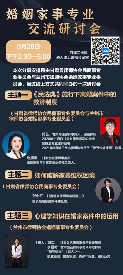本次研讨会由省律协民商委副主任赵挺婷与市律协婚家委主任安小敏主持,会议围绕婚姻家事领域的热点问题进行交流讨论,共分为三个部分进行主题分享,每轮分享后既围绕该主题进行线上讨论。