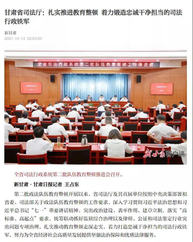 第二批政法队伍教育整顿开展以来,甘肃省司法厅及其直属单位按照中央、省委、司法部关于政法队伍教育整顿的决策部署和工作要求,深入学习贯彻习近平法治思想和习近平总书记“七一”重要讲话精神,突出政治建设、表率作用、建章立制,落实“高标准、高起点”要求,扎实推动教育整顿走深走实,统筹联动抓好监狱综合治理以及律师、公证和司法鉴定行业突出问题专项治理,着力打造忠诚干净担当的司法行政铁军,努力为全省经济社会高质量发展提供坚强法治保障和优质法律服务。