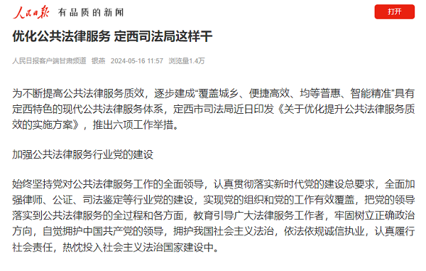 5月16日,人民日报客户端刊文发布了甘肃省司法厅推荐的工作新闻稿件——《优化公共法律服务 定西司法局这样干》,现予以转载。