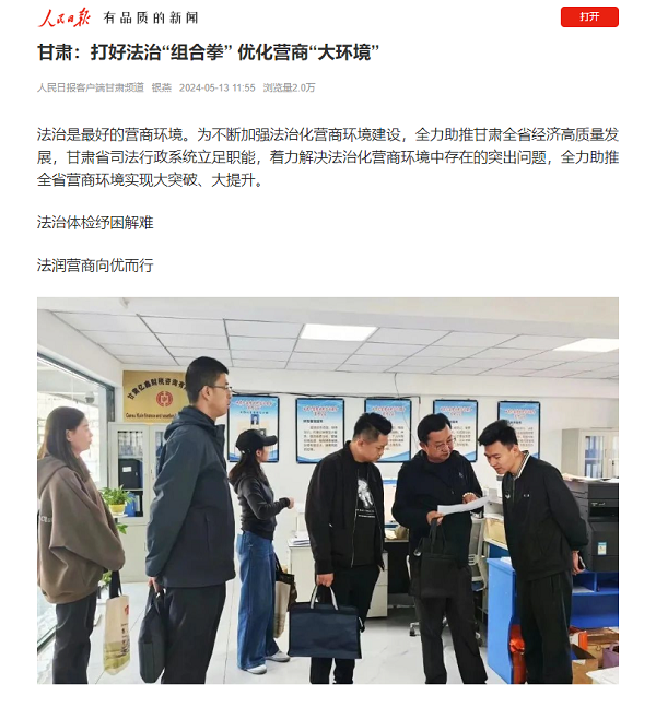 5月13日,人民日报客户端刊文发布了甘肃省司法厅的工作新闻稿件——《甘肃:打好法治“组合拳” 优化营商“大环境”》,现予以转载。