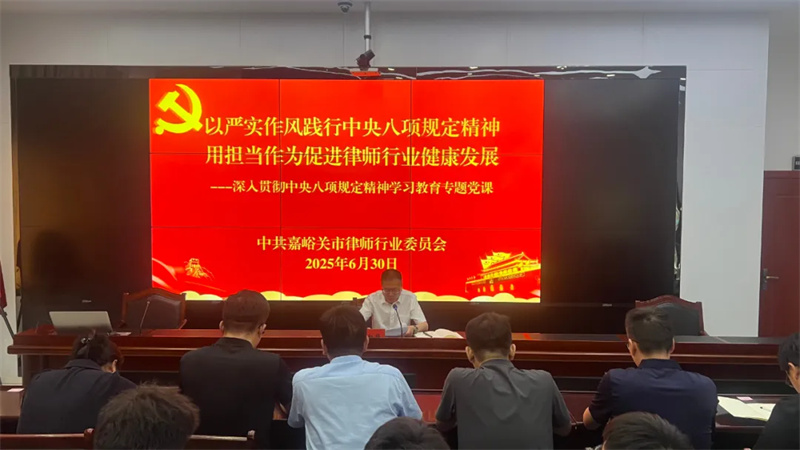 党课强调,贯彻中央八项规定是律师行业长期任务,全体党员需以此次党课为契机,带头打造“政治坚定、法律精通、维护正义、恪守诚信”的律师队伍,为嘉峪关市经济社会发展提供优质法治保障,以实际行动向党的104周年华诞献礼。