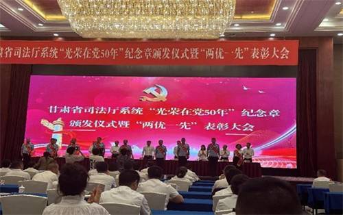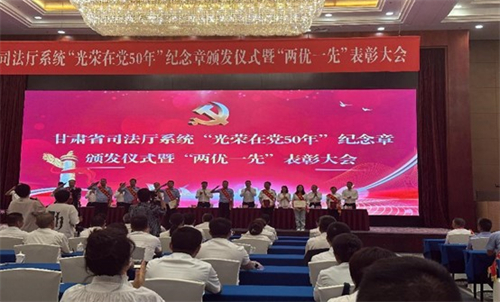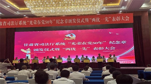 7月13日,甘肃省司法厅举行“光荣在党50年”纪念章颁发仪式暨“两优一先”表彰大会。会议在庄严的国歌声中拉开帷幕,会议向5名老党员代表颁发了“光荣在党50年”纪念章,表彰了省司法厅系统26个先进基层党组织,26名优秀党务工作者和54名优秀共产党员。