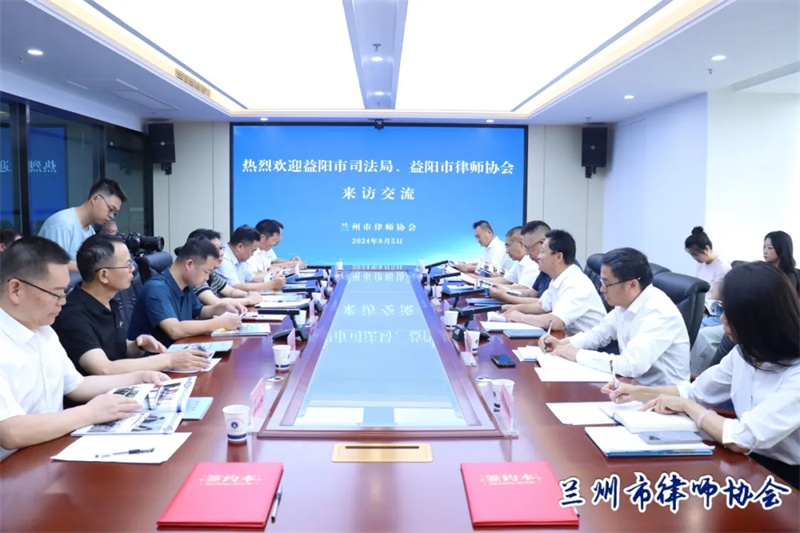 2024年8月5日,湖南省益阳市司法局党组书记、局长曾戈彬,益阳市律师行业党委书记朱正鹏,益阳市律师协会会长徐健、监事长龚红卫等一行16人到访我会。兰州市司法局党组成员、副局长、市律师行业党委书记苏泽云出席会议,兰州市律师协会会长陈灿主持会议。