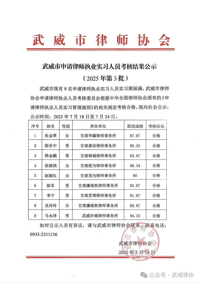 为提高律师行业准入门槛,把好律师行业“入门关”,2025年7月17日,武威市律师协会组织开展2025年度(第三期)实习律师面试考核,全市9名实习律师参加了考核。此次考核,由武威市律师协会陈守安、沈学先、刘金生三位会长组成考核小组。考核小组从政治素质、道德品行、职业素养和实习表现等多个方面对实习律师进行了全面考察,根据实习律师综合表现,结合考评表中的考核要求和评分标准,做出书面客观地评分。