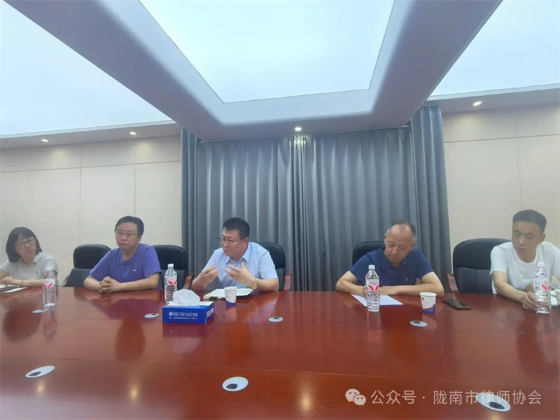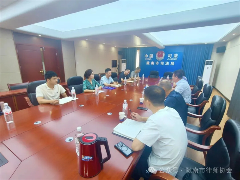 7月27日下午,陇南市律协部分班子成员与李瑞庆副会长在市司法局会议室进行了深入交流座谈。会议由陇南市律协会长李文阁主持,副会长张刚、董军翔,秘书长袁麒涛、副秘书长雷雳、孙雪、杨小康和部分律所负责人参加。