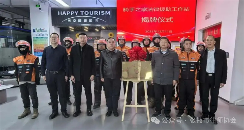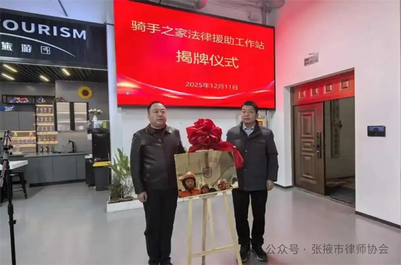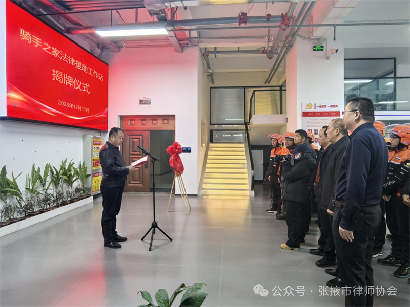 2025年12月11日上午,由张掖市律师协会深度助力的“骑手之家”法律援助工作站揭牌仪式在甘州区滨河新区中广大厦二楼举行。张掖市司法局党组成员、副局长谈栋,张掖市公共法律服务和信息中心主任管磊、张掖市律师协会副秘书长杨发军、张掖市律师协会破产重整专业委员会主任陆永达等律师代表以及甘州区总工会、甘肃幸福安捷人力资源服务有限公司相关负责人、骑手们参加了仪式。