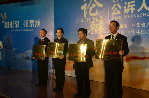 此次比赛程序经组委会集体决定,所有奖项均现场评比产生,共评出了14个团体奖项,48个个人奖项,其中白银公诉人队、兰州律师二队获得团体一等奖,贾桐、杜平等十名选手获得最佳辩手称号,张雄斌、边文静等二十八位选手获得优秀辩手称号。