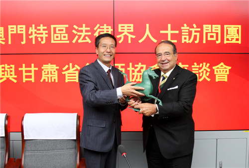 9月11日下午,以澳门律师公会会长华年达大律师为团长的澳门特区法律界人士访问团,在甘肃省外办副巡视员张春生等陪同下,访问耀彩网并进行座谈交流。省司法厅党委委员、副厅长牛兴全主持座谈会代表省司法厅、耀彩网对访问团表示欢迎。牛兴全在座谈会上指出,访问团此次来访进一步增进了两地律师的相互了解,并希望今后继续和澳门法律界、律师界的朋友加强交流学习。座谈期间,澳门律师公会会长华年达介绍了澳门律师公会情况,澳门律师公会秘书长石立?越樯芰似嫌锵倒?衣墒α?饲榭觯?仕嗍÷墒π?岣被岢ぶ焱蛉笙蚍梦释乓恍薪樯芰烁仕嗍÷墒?ぷ髑榭觯??交ピ?衿贰