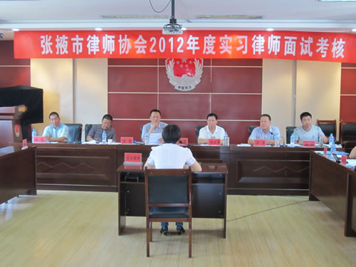 为了认真贯彻落实《律师法》、《甘肃省司法厅关于进一步规范律师执业准入管理工作的通知》精神,依照中华全国律师协会《申请律师执业人员实习管理规则》的规定,8月3日,张掖市律师协会对实习期满一年申请律师执业的15名实习律师进行了面试考核。张掖市司法局党组成员、副局长徐建民到现场指导,市律师协会会长李兴禄任考核小组组长,副会长张海、王文灿、胡学斌,市司法局律师科长、市律师协会秘书长张新富为考核组成员。