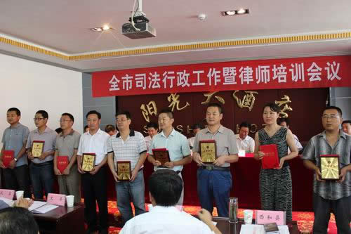 全市律师工作会议由市司法局副局长王仲煦主持。市司法局副局长曾小宁宣读了《陇南市司法局 陇南市律师协会关于表彰2011年度全市优秀律师事务所和优秀律师的决定》。与会领导给受到奖励的3家“优秀律师事务所”和10名“优秀律师”颁发了奖牌和荣誉证书。会上,12名新执业律师面对国旗举行了庄严的宣誓仪式。