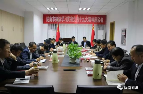 为学习贯彻党的十九大精神,10月27日,陇南市律师协会常务理事(扩大)会在甘肃阶州律师事务所召开。座谈会由市律师协会会长耿军林主持,市司法局党组书记、局长夏建华出席会议并做学习辅导,党组成员、副局长王仲煦列席会议。