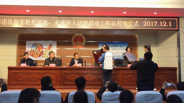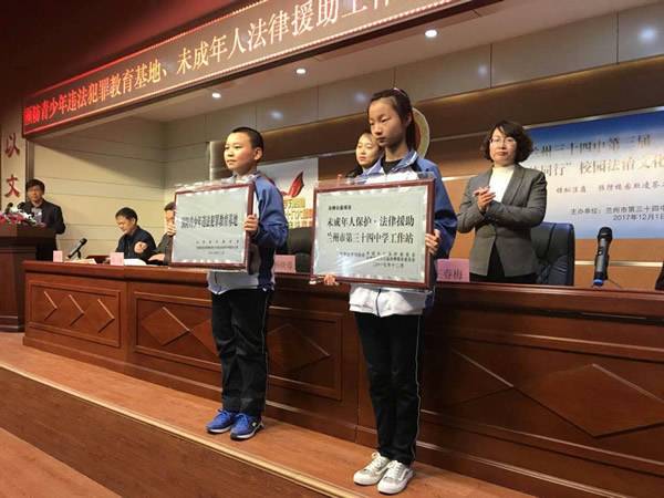 活动期间,共青团甘肃省委青年发展与权益维护部杨晓蓉部长为兰州三十四中授牌设立“预防青少年违法犯罪教育基地”,耀彩网两委会王春梅律师为学校授牌设立“未成年人保护、法律援助兰州三十四中工作站”。