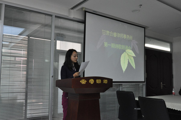 朗诵活动开始后,社长程新林律师以一首《黄鹤楼》作为开篇朗诵震撼全场,随后各位律师都积极踊跃上台各展风采。许丽敏律师朗诵了《我愿意是激流》,袁文进律师朗诵了《忍住了看你却忍不住想你》,郭琳律师朗诵了《如果生活不够慷慨》,石宜凡律师朗诵了《以梦为马》,罗娟律师朗诵了《相信未来》,吴小潘律师朗诵了《让我怎样感谢你》,刘玉红律师朗诵了《悯农》,王济律师朗诵了《短歌行》,李宁律师朗诵了《阳光在远处》,最后合睿诗社的特邀嘉宾张静老师以一首饱含深情的《军礼》圆满结束了本次活动的朗诵环节。 在分享环节里,各位律师都积极发言分享本次朗诵活动的心得体会,社长程新林律师和特邀嘉宾张静老师以专业角度对各位律师的朗诵作了精彩点评,该所主任王金贵律师也对本次朗诵活动作了总结性点评,对本所律师能够积极参加“诵读中华经典,营造书香律所”活动作了肯定的评价。