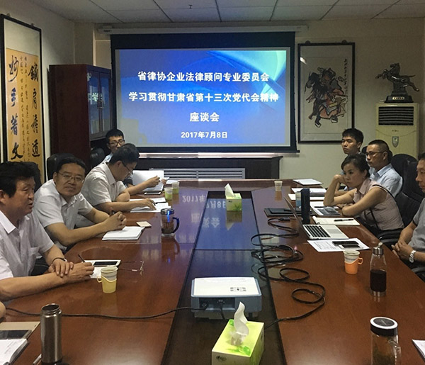 座谈会首先介绍了2017年5月26日中国共产党甘肃省第十三次代表大会决议通过中共甘肃省第十二届代表大会常务委员会的工作报告内容, 《报告》在总结甘肃省过去5年社会各方面发展经验的基础上,展望了未来5年甘肃省的发展目标,主要集中在一是转变经济发展方式,推进经济结构调整;二是推进科技进步和创新;三是发展现代农业,增强农产品供给能力;四是加快扶贫开发;五是加强生态环境保护;六是保障和改善民生;七是加强社会管理,维护社会稳定。在新一轮的经济发展大环境下,为我省律师行业发展提供了机遇和机会。其次,各委员会成员依次作了自我介绍,并且结合本次报告的内容,展开讨论关于在经济发展大环境下企业法律顾问服务及律师的业务拓展问题。