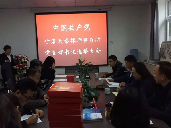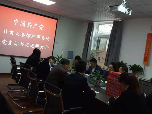 2018年10月24日,中国共产党甘肃天秦律师事务所党支部书记选举大会在天秦所胜利召开,天秦所5名党员律师代表充分行使党员权利,选举产生了中国共产党甘肃天秦律师事务所党支部书记。天水市律师行业党委副书记胥汉民同志,党委委员康玉兰同志,天水市司法局政治部郭儒廷同志出席大会。大会由甘肃天秦律师事务所副主任李燕同志主持。