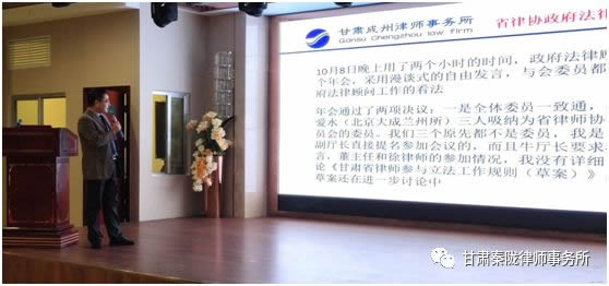 行政诉讼与政府法律顾问委员会副主任、甘肃秦陇律师事务所主任张刚律师,甘肃阶州律师事务所副主任何兴民律师,甘肃宇彤律师事务所主任刘红梅律师,甘肃北辰律师事务所张兴龙律师,甘肃秦陇律师事务所闻实律师在会上做了交流发言,讲述了担任政府法律顾问的做法和感受,让与会人员受益匪浅、深受启发。