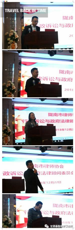 会议第二项由陇南市律师协会会长耿军林传达学习习近平总书记在纪念改革开放四十周年座谈会上的讲话精神,并通报了我市律师担任政府法律顾问工作的开展情况。耿军林会长充分肯定了政府法律顾问律师参与涉法事务、推进法治政府建设的积极作用,并对下一年度的工作提出了新的要求。