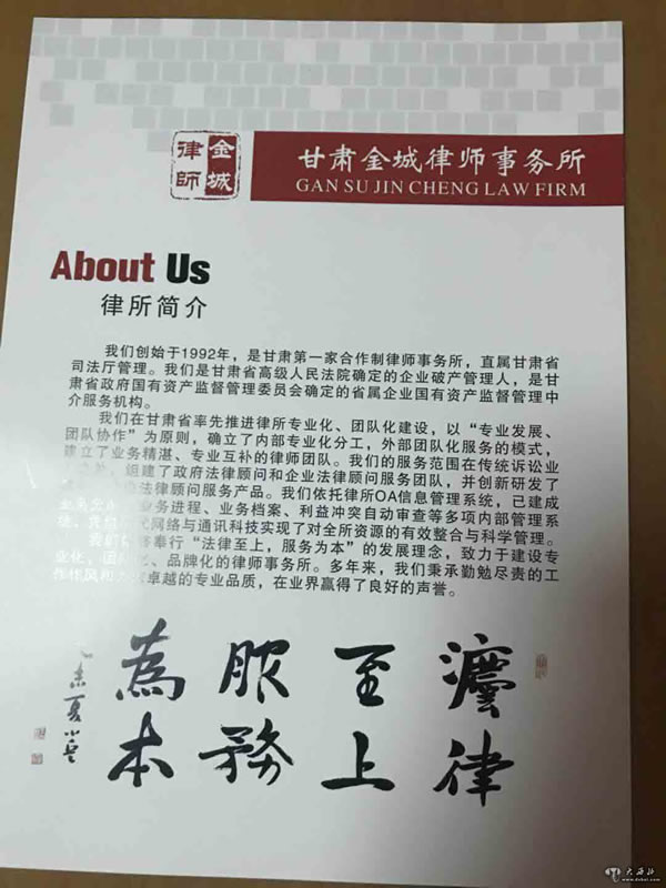 甘肃金城律师事务所是一家成立26年的律师事务所,是甘肃第一家合作制律师事务所。金城律师事务所主任王祖国表示,以前他们律师事务所提供综合服务,什么都代理,但是又不能专注一个领域钻研。但是面对一个行业发展的趋势,只有改变才能赢得更好的未来。为此,甘肃金城律师事务所选择政府和企业专业法律服务为突破口,在这一领域继续细化深耕,总结出了一套适合甘肃实际的律所专业化发展之路。据悉,近年来甘肃金城律师事务所在甘肃省率先推进律所专业化、团队化建设,以"专业发展、团队建设"为原则,确立了内部专业化分工,外部团队化服务的模式,建立了业务精湛、专业互补的律师团队。
