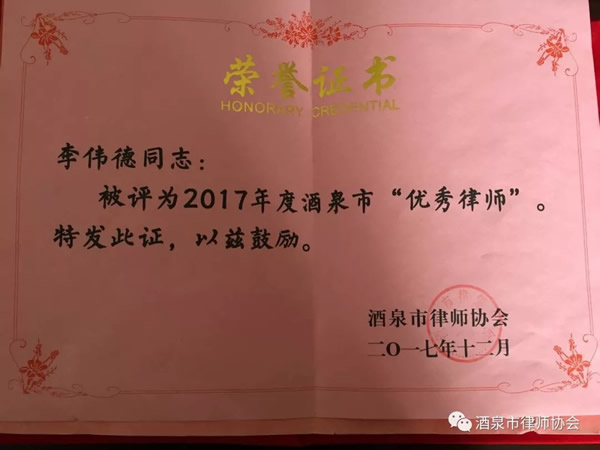 2017年12月被酒泉市律师协会评为2017年度酒泉市优秀律师