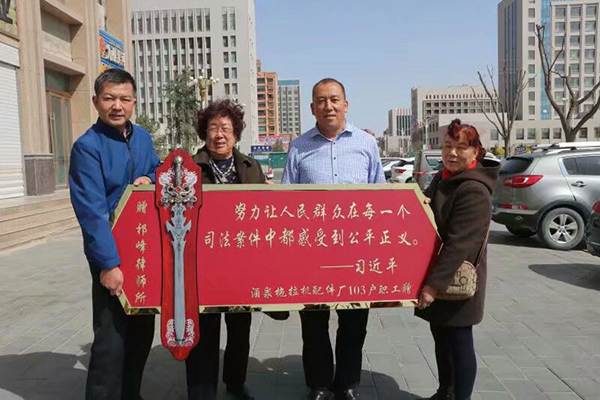 在甘肃祁峰律师事务所会议室正中,挂着一副特别的“锦旗”,是由一柄剑和金属框制作的匾牌,匾牌上金色大字书写习近平总书记的一句话:努力让人民群众在每一个司法案件中都感受到公平正义。——酒泉拖拉机配件厂103户职工赠。