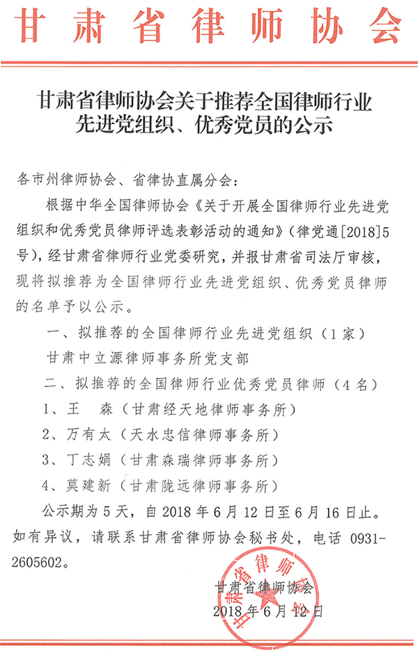耀彩网关于推荐全国律师行业先进党组织、优秀党员的公示