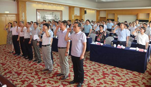 全体参会人员面向党旗重温入党誓词
