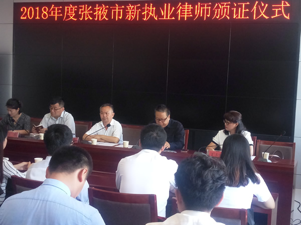 2018年8月4日上午9时,张掖市司法局、张掖市律师协会在张掖市司法局十四楼会议室为新执业律师举行了执业证颁发及宣誓仪式。张掖市司法局副局长赵光升、张掖市律师协会副会长王文灿、王杰、丁志娟、张掖市司法局律师管理科科长殷新宇以及新执业的22名律师参加了会议,会议由张掖市律师协会副会长王杰主持,赵光升副局长作了讲话。