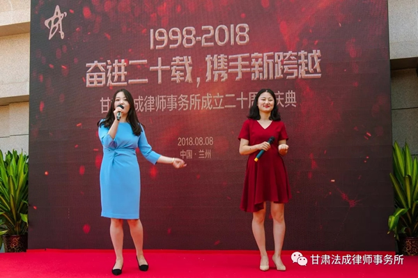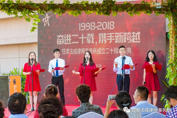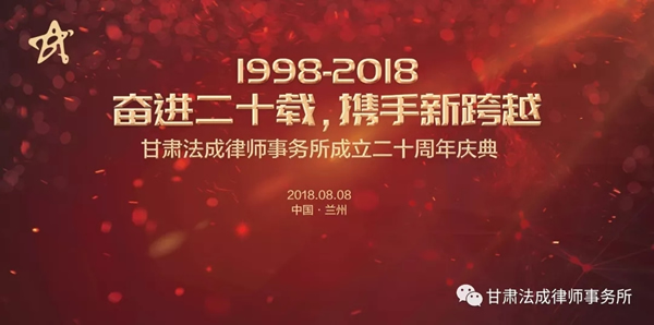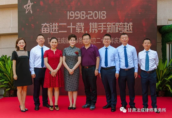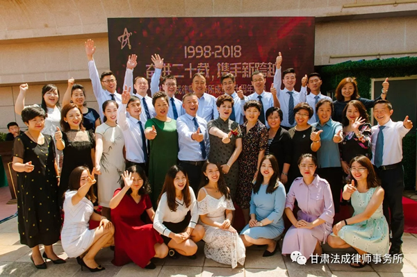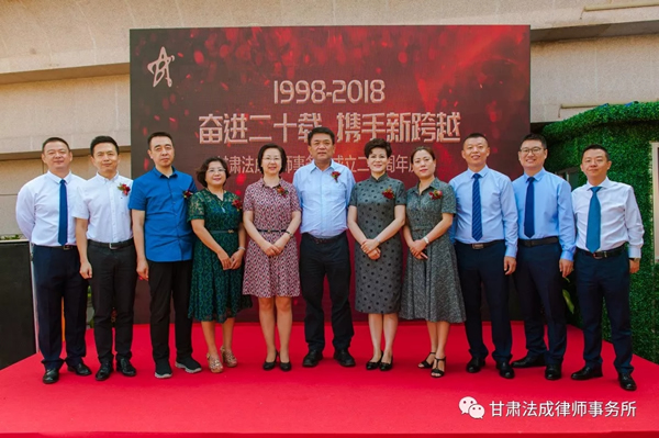2018年8月8日,甘肃法成律师事务所成立20周年庆典在天庆国际商务大厦四楼法成所露台隆重举行。本次庆典以“奋进二十载 携手新跨越”为主题,省市律协领导、律师同行、客户代表欢聚一堂,共同庆祝法成20华诞。