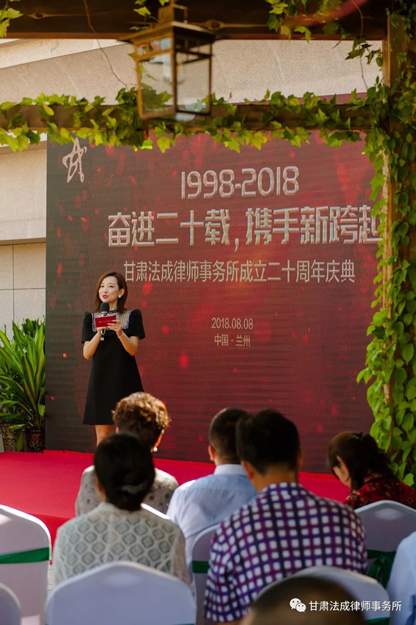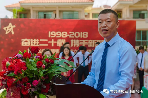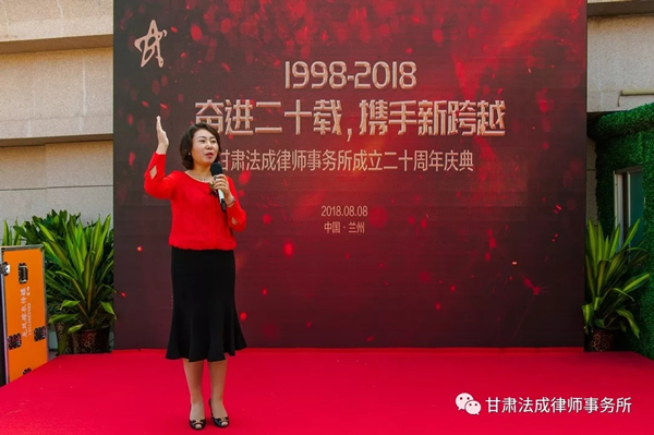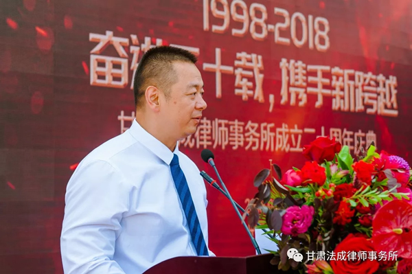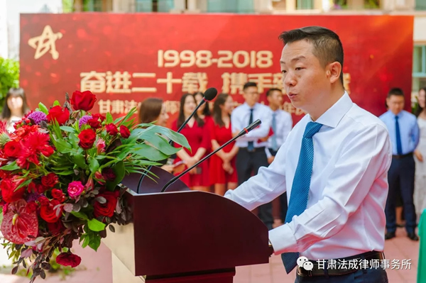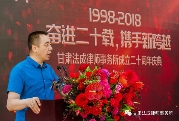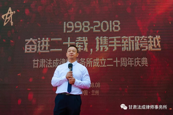 上午10点,在回顾过往、展望未来的法成宣传片中,本次庆典拉开了帷幕。20年的风雨沧桑,20年的矢志不渝,铸就了法成20年的辉煌成就。甘肃法成律师事务所王亦农主任首先致辞,表达了20年来法成人对法律事业的执着与热情,对未来的期盼和坚定的信念,秉持着崇法、尚德、守成、鼎新的律所文化的法成人,有理由期待一个更加辉煌灿烂的明天。