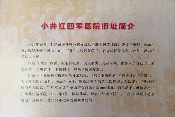 1928年5月,毛泽东、朱德两支部队在井冈山胜利会师后,在井冈山的大小五井,建立了取名叫“红军医院”的后方医院。医院分四个管理组:第一、二组设在大井村,第三组设在中井村,第四组设在小井村,院部设在中井村。当年冬天,为了改善医疗条件,红军战士用平时省下来的伙食费集资捐款,根据地在小井建成了红军医院住院部,取名“红光医院”。但革命形势容不得红军改善医疗条件,1929年1月底,由于叛徒贪财出卖,井冈山军民第三次反“会剿”失利,敌军窜入小井村,烧毁了红光医院,并把来不及转移的130多名重伤员押到小河边的稻田里,对他们威逼拷打后集体枪杀。