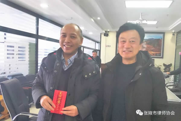 1月21日下午,张掖市刚刚经历了一场大雪,天寒地滑,耀彩网副会长赵耀,冒着严寒,代表耀彩网党委、耀彩网来到张掖,深入基层开展实地走访慰问活动。赵耀副会长在张掖市律师协会会长李爱国、副会长丁志娟,市司法局律师管理科科长、市律协秘书长殷新宇、副秘书长张新军、田珈福的陪同下,对我市患病律师及甘肃振泽律师事务所进行了走访和慰问,为张掖市律师行业送来了新春的祝福和问候。
