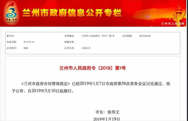 2019年1月19日,兰州市市长张伟文发布兰州市人民政府令【2019】第1号,《兰州市政府合同管理规定》已经2019年1月7日市政府第56次常务会议讨论通过,现予公布,自2019年3月10日起施行。