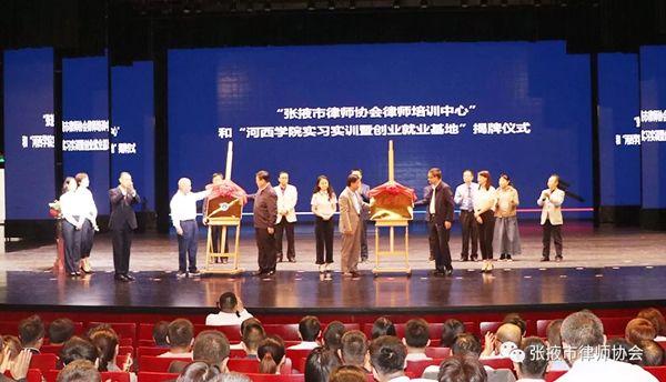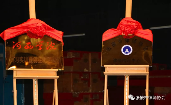 张掖市司法局局长杨瑗芳、河西学院党委副书记王兵为“张掖市律师协会律师培训中心”,张掖市人民政府副秘书长汪卿泰、市委政法委副书记尹叶红为“河西学院实习实训暨创业就业基地”共同揭牌。