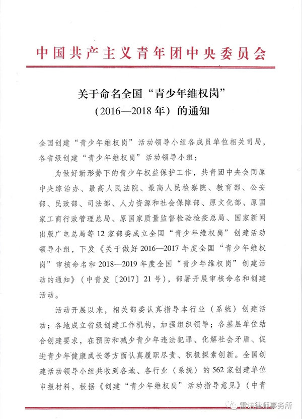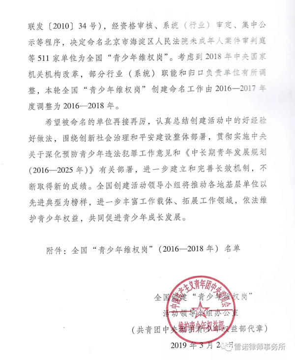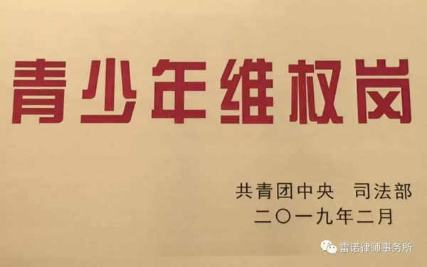 日前,由共青团中央、司法部等十二部委组成的全国“青少年维权岗”创建活动领导小组,经资格审核、系统(行业)审定、集中公示等程序,在全国命名了一批法院、检察院、律师事务所、教育部门等单位为“青少年维权岗”,甘肃省司法系统中两家单位获此称号,雷诺律师事务所名列其中,是全国被命名为“青少年维权岗”的9家律师事务所之一。