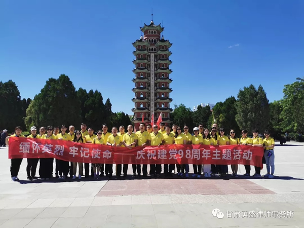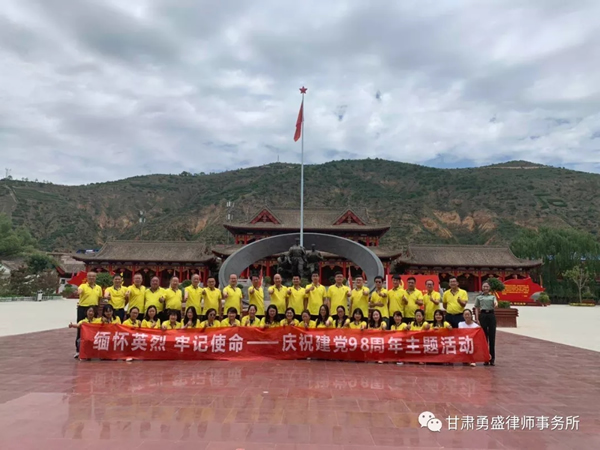 为迎接中国共产党成立98周年,2019年6月28日至2019年6月30日,甘肃勇盛律师事务所组织全所党员律师、入党积极分子及部分非党员律师赴会宁、静宁等地开展“缅怀英烈、牢记使命”庆祝建党98周年主题活动。