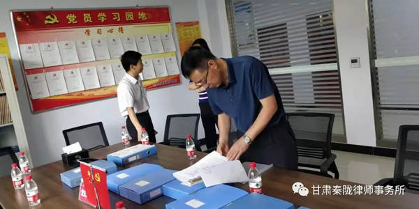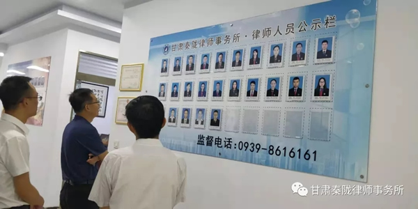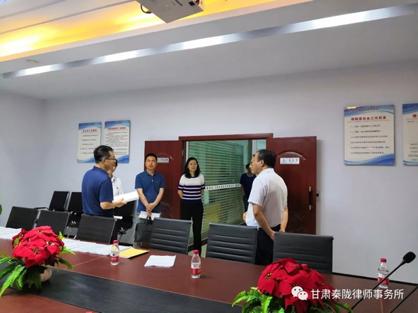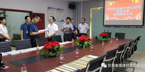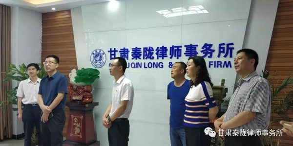 2019年7月18日上午,甘肃省司法厅党委委员、副厅长、甘肃律师行业党委书记韩世峰一行在陇南市司法局党组成员、副局长王仲煦、武都区人民政府副区长牛军平、武都区司法局副局长刘隽?等同志的陪同下莅临我所,就我所党建工作及律所规范化建设进行检查指导。