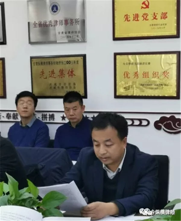 调研中,武威市司法局及律师行业党委在纵横律所会议室召集市局律师科负责人、各县区司法局长、市律协各会长、市律师行业党委委员、各律所党支部书记及负责人召开“全市律师行业党建工作座谈会”。会议由市司法局长姜立新主持,副局长傅瑞川汇报了全市律师行业党委成立以来工作情况,行业党委副书记赵庆年汇报了党建具体工作及需要改进的几个问题,凉州区、民勤县、古浪县、天祝县司法局长汇报了各县区律师党建工作,各律所党支部书记书面汇报了各自党建工作。大家整体认为,全市律师行业党建“全覆盖”工作正在有序推进落实,但“全规范、全统领”工作差距较大,急需迎头赶上。