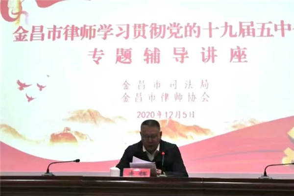 12月5日,金昌市举办全市律师学习贯彻党的十九届五中全会精神专题讲座,深入学习贯彻党的十九届五中全会精神。副市长、市委政法委副书记、市公安局党委书记、局长李辉主持讲座并作了讲话。金昌市全体律师、全市基层法律服务工作者、市区司法局全体干部职工共150余人参加了本次讲座。