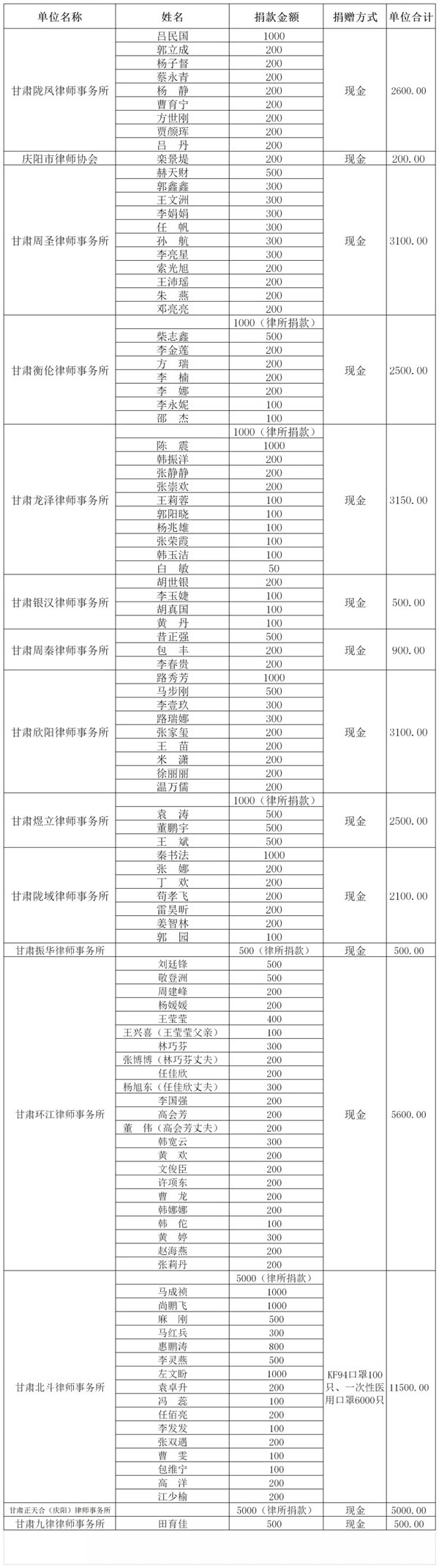蔓延至全国范围内的新型冠状病毒感染的肺炎疫情牵动着每一个人的心。特别是在庆阳市首例病例确诊后,全市疫情防控形势进入到更加严峻、艰巨的阶段。为助力抗击疫情,庆阳律师积极行动,通过捐赠医疗用品及资金的方式,彰显律师对国家、社会的责任担当与大爱。2月3日,庆阳市律师协会发出募捐倡议后,全市律师事务所、法律援助中心、全体律师及部分律师家属积极响应。截止2月5日,市律协已收到价值11500元的医护用品(KF94口罩100只、一次性医用口罩6000只)及32250元现金。同时,有5名律师根据市新联会的倡议捐款3600元,还有部分律师通过甘肃省青少年发展基金会、湖北省慈善总会等机构自愿捐款。目前,全市律师行业捐赠活动仍在持续进行中。