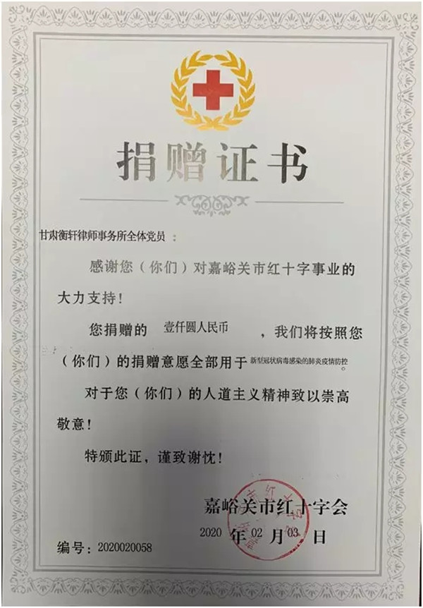 2020年2月1日,由本所党员律师召开紧急会议,向嘉峪关市红十字会捐款1000元。