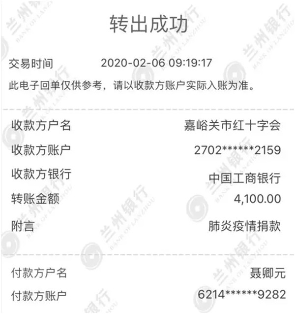 2020年2月3日本所党员律师率先向嘉峪关市红十字会捐款1000元