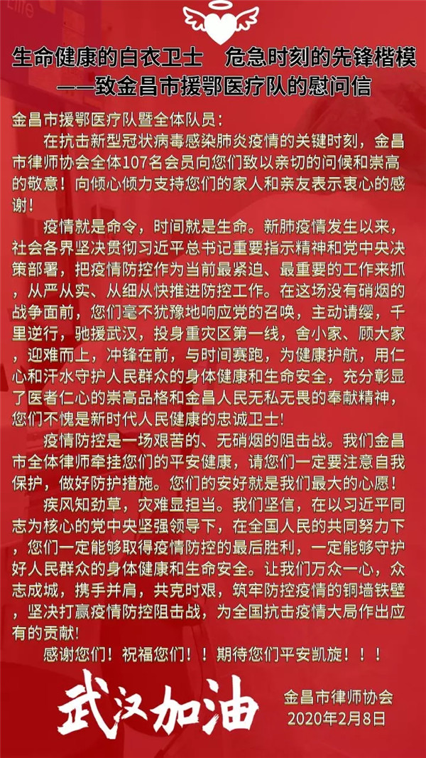 在此,金昌市律师协会全体107名会员向在前线狙击疫情的医护人员、工作人员致以最崇高的敬意,同时,我们向“市援鄂医疗队”的全体成员及家人表示衷心的感谢。
