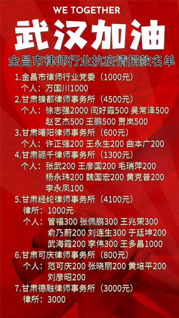 “四海皆兄弟,谁为行路人”。2月8日上午,市律师行业党委书记万国川、律协会长陈炷昌、副会长姜有生、秘书长王虎、吴常泽代表市律师行业党委和市律协直接向金昌市卫健、金昌市红十字会进行了捐赠,市卫健、市红十字会代表“市援鄂医疗队”向全市律师表示了衷心的感谢。