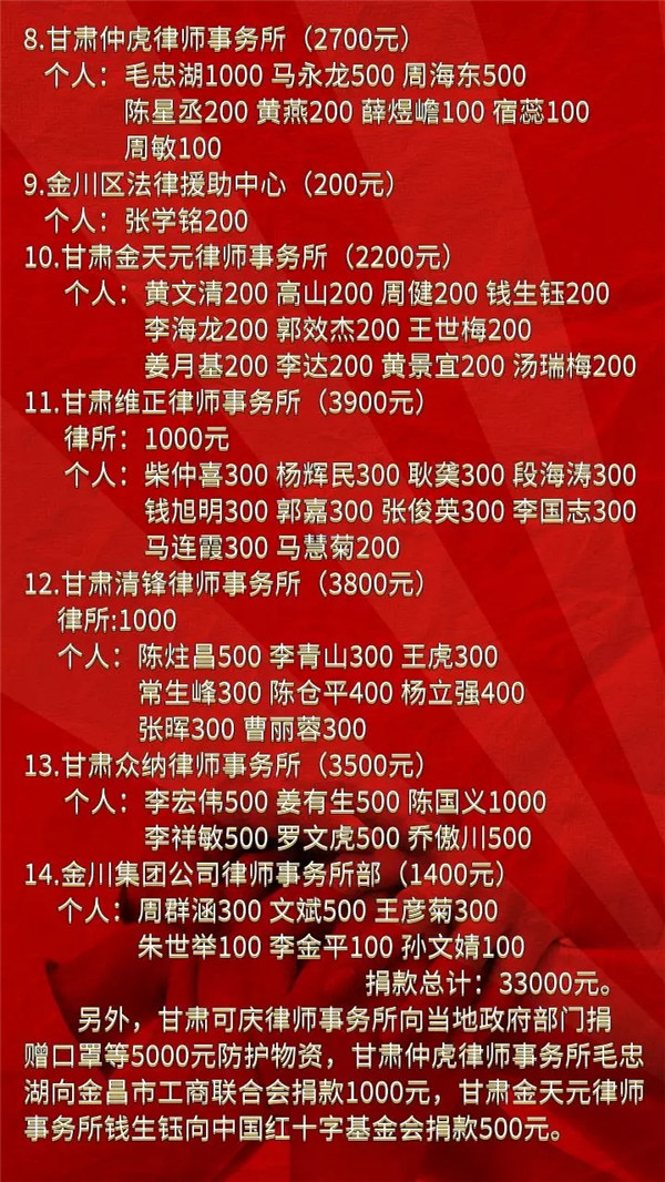 此次募捐活动,本着自愿原则,以律师事务所为单位组织,募捐善款通过金昌市卫健委、金昌市红十字会向金昌市“援鄂医疗队”进行专项捐赠,专门用于给医疗队采购医疗防护用品和生活补贴。截止2月7日,全市律师事务所及律师共捐款33000元。部分律所、律师还自发向当地政府部门和中国红十字基金会直接捐助各类防疫物资和资金。市律协将持续关注疫情发展和防控、救治需要,充分发挥律师协会职能,积极履行社会责任,全力配合党委政府打赢这场“没有硝烟的战争”。