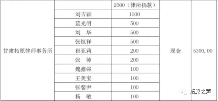 5.爱心奉献,携手相扶。 2月3日,在庆阳市律师协会发出向新型冠状病毒感染的肺炎疫情定点救治医院进行募捐的倡议后,拓原律师事务所及拓原律师积极响应,律所捐款2000元的,每位律师及实习律师纷纷捐款,金额从千元到百元不等,奉献了拓原人的无疆大爱。其中,有50年党龄的老律师邱宪东以特殊党费的形式向党支部缴纳党费500元用于疫情定点救治医院,实习律师张馨尹在已经向北京韩红爱心慈善基金会捐赠200元的基础上,继续参加律所的募捐。