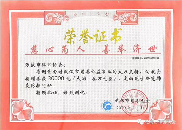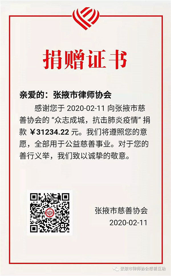 三、2月2日,张掖市律师协会在全市律师行业范围内发起了“同舟共济、抗击疫情” 募捐倡议,并制定、公示了《募捐资金使用方案》。
