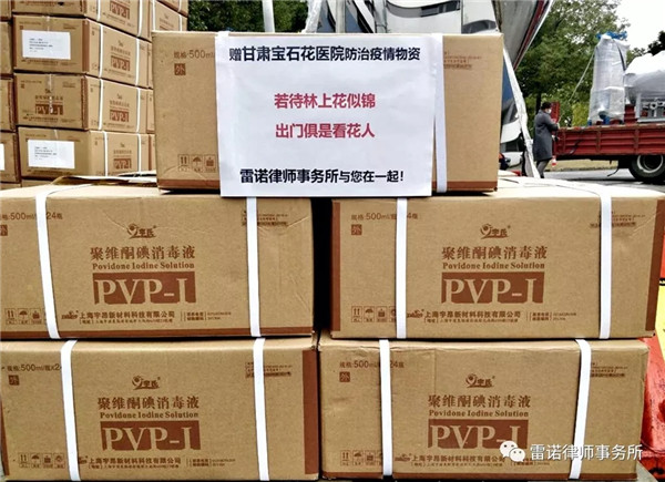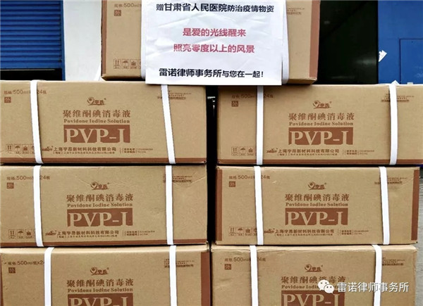 新冠肺炎疫情阻击战打响以来,雷诺律所党支部严格落实兰州市律师行业党委、兰州市律师协会关于疫情防控的决策部署,引领本所全体律师积极履行社会责任,分别捐赠给甘肃省人民医院、兰州大学第一医院和甘肃宝石花医院(原兰州石化总医院)等三家医疗机构一批价值25000元的消毒液。