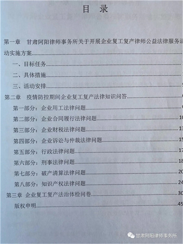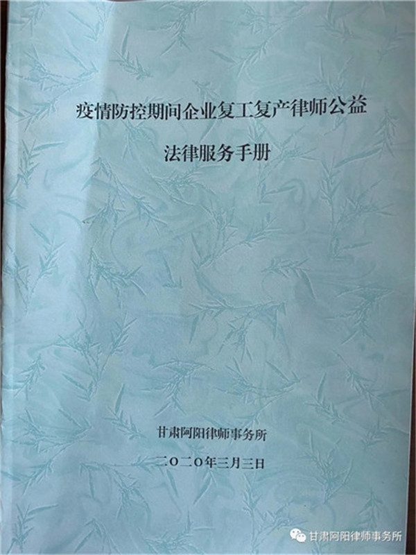 为深入贯彻落实习近平总书记重要指示精神和党中央、国务院决策部署,认真践行“不忘初心、牢记使命”主题教育精神,充分发挥律师职能作用,为全县疫情防控和促进全县经济社会发展提供法律服务和法治保障。我所按照平司办发(2020)22号《平凉市司法局关于转发<司法部办公厅关于印发企业复工复产律师公益法律服务指南的通知>的通知》的安排部署,召开专门会议研究制定甘肃阿阳律师事务所《关于开展企业复工复产律师公益法律服务活动实施方案》。旨在通过开展企业复工复产律师公益法律服务活动,帮助企业在法治轨道上安全有序复工复产,完善法律风险防范机制,防控企业法律风险,在法律政策宣讲、法律风险防范、矛盾纠纷化解等方面,提供多样化、差异化、精准化服务,助力企业解难题、防风险、保经营、促发展。