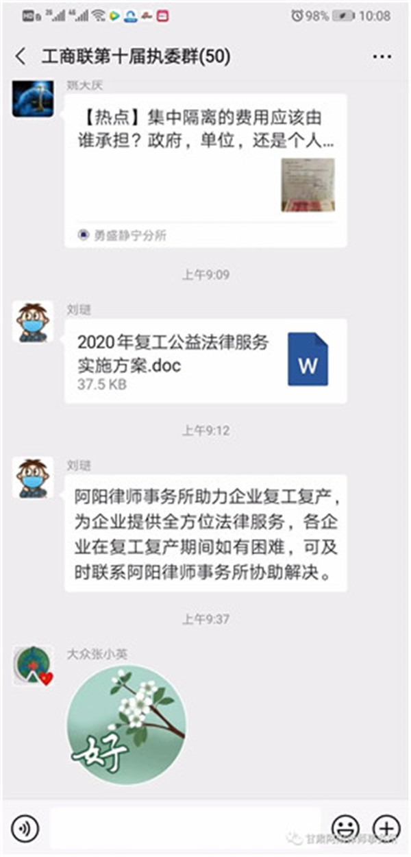 按照我所《实施方案》的部署要求,我所全体律师组建成五个公益法律服务团,各组各司其职、明确责任、严格分工,健全工作举措,优化服务方式,为复工复产企业、员工提供了更加精准有效的法律服务,助力企业有复序平稳复工复产,为战“疫”增添了战斗了。